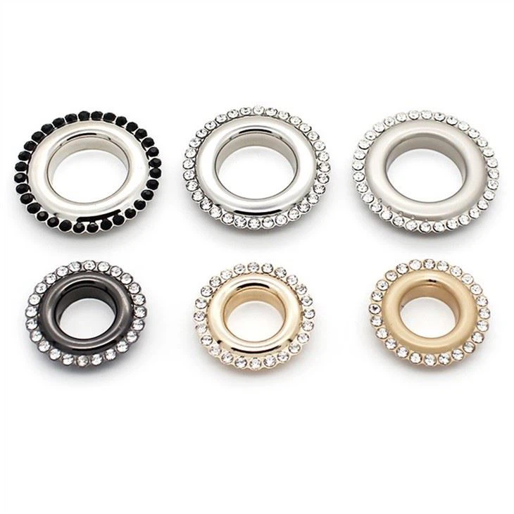 Kovové priechodky sa používajú na posilnenie malých otvorov a zdobenie výrobku, ktorý je vhodný na použitie na papieri, koži, tkanine a iných materiáloch. Kovové grommenty pre tkaninu sú nastavenie s diamantmi, čo je skvelé pre dekoráciu tašiek, odevov a koženého tovaru.