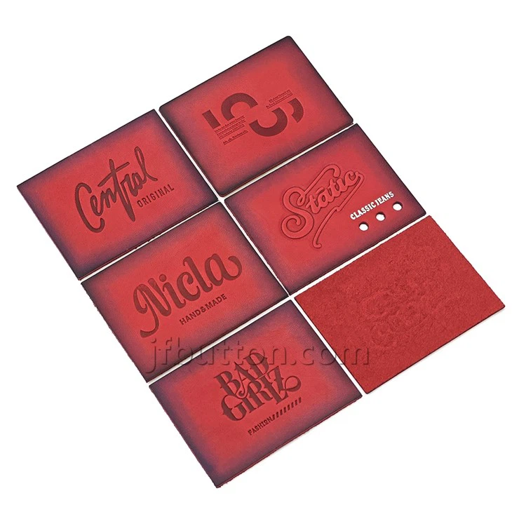Kunshuo's Leather Clothing Label prijíma dizajn červeného gradientu, ktorý vytvára retro vizuálny efekt, ktorý je vhodný pre jedinečné džínsy a značky bundy.